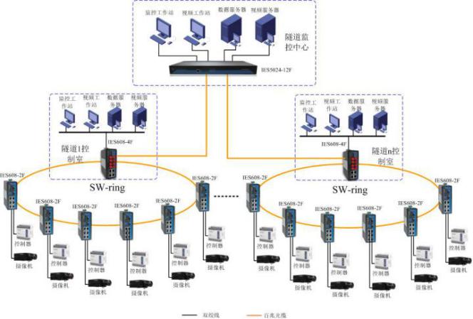 此隧道监控方案在隧道内部采用了SW-ring环网,将隧道内的PLC控制器及摄像机接入到以太网。摄像机和PLC控制器接入到就近的IES608-2F工业以太网交换机,然后与隧道监控室IES608-4F组建成SW-ring环网,从而实现了冗余功能。隧道监控室的IES608-4F通过一个百兆光口,将隧道内数据上行至监控中心,监控中心采用IES5024-12F。整个网络采用光传输,信号不受外界环境的干扰,使得网络相当的稳定。监控层采用星型拓扑结构,其扩展型非常的强,采用VLAN技术进行广播域的减小,每个隧道之间的数据是相对互相独立,不会相互干扰,大大提高了系统的稳定性。隧道监控室数据上行时采用的是光口。而不是采用光纤收发器,从而减少了整个网络中的节点数,从物理上降低了网络的故障率。