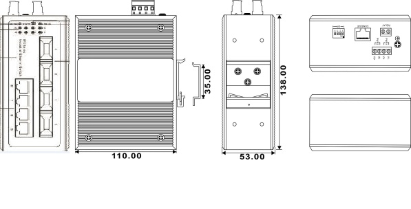 支持4个10/100Base-T(X)电口和4个100Base-FX光口 Console口:调试串口 告警端口:2芯7.62mm间距接线端子, 1路继电器告警信息输出, 电流负载能力1A@24VDC |